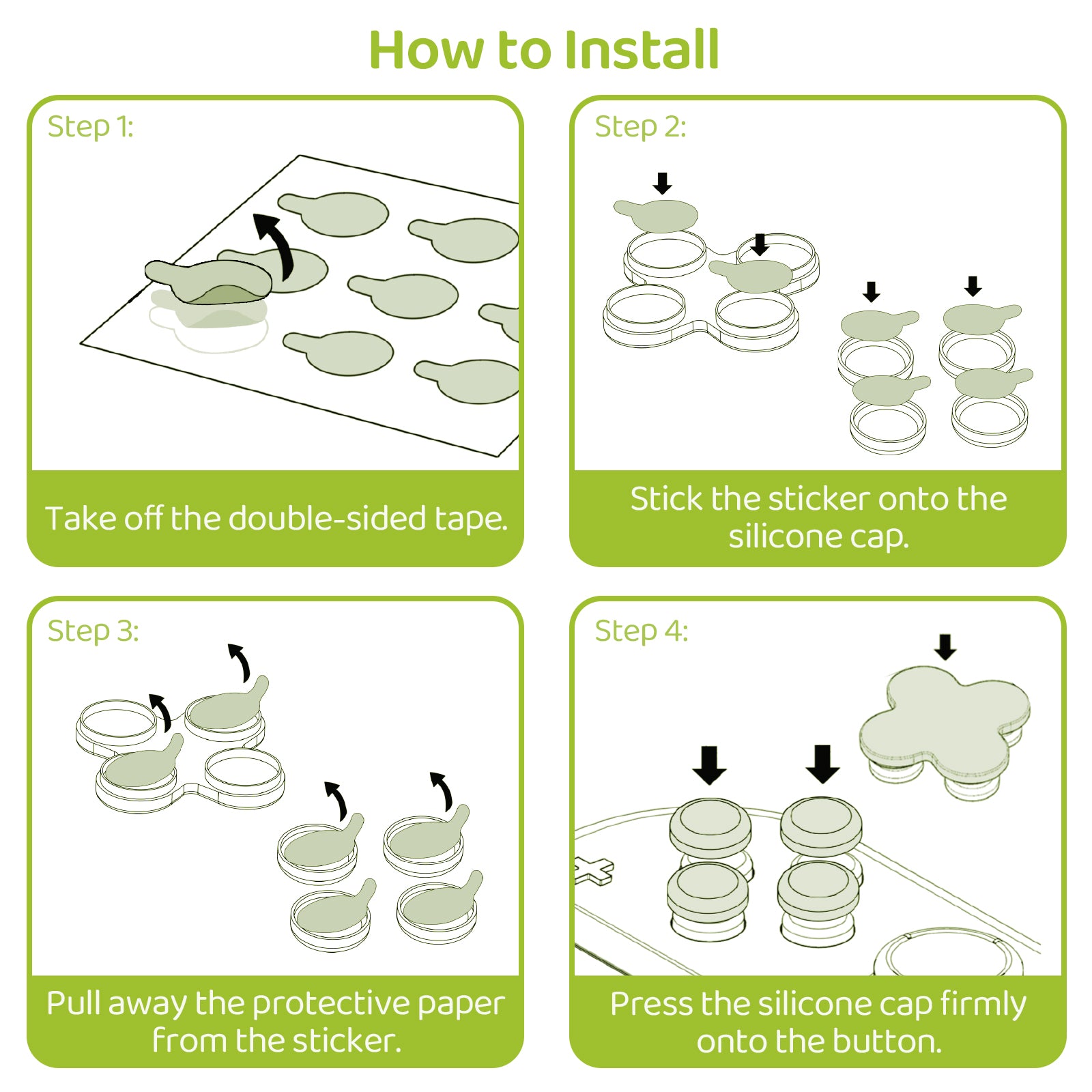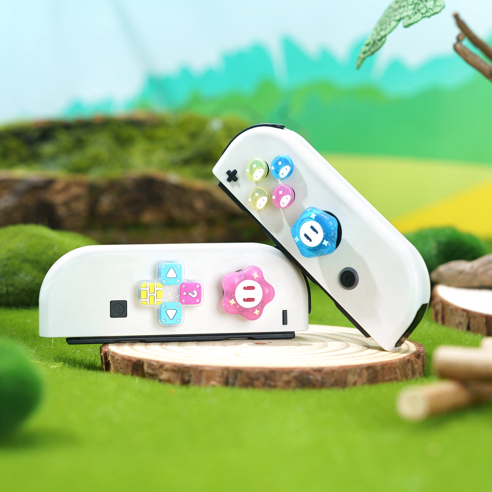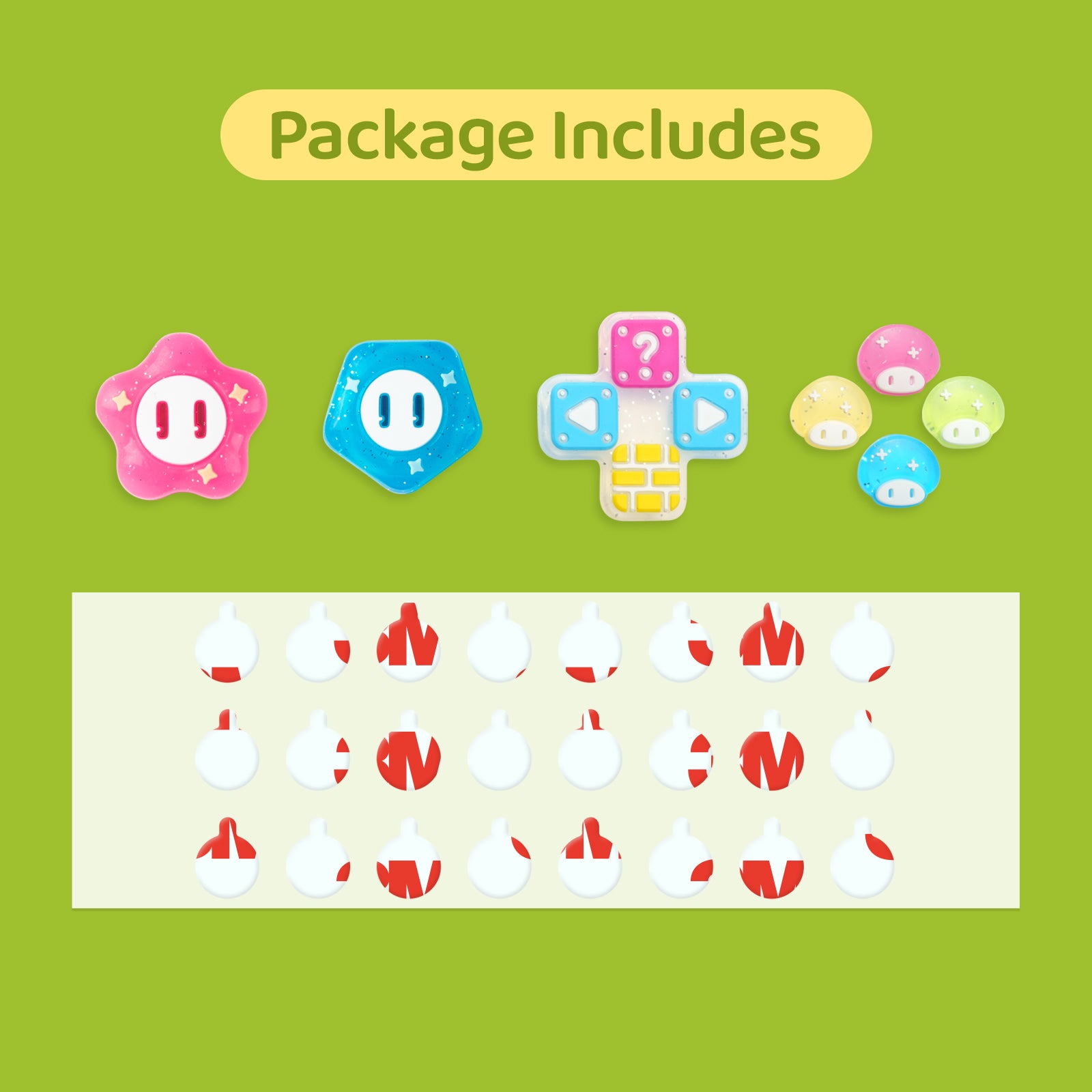 🍄Package Includes:1 Set ABXY key button caps + 1 * D-pad button cap + 2 * joystick caps + 1 sheet of stickers. Please note that the D-pad button cap compatibles with skin stickers, but not most protective shell/cases.